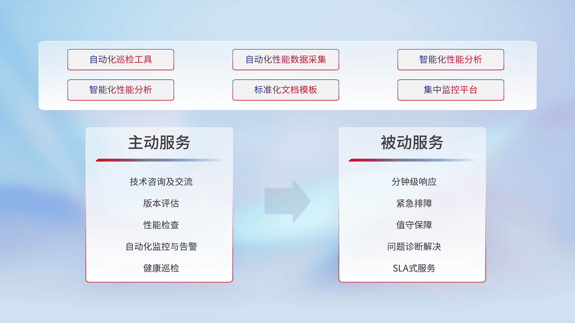 智能化工具和标准化文档,,,保障服务质量,,提供主动服务(包含技术咨询、、、版本评估、、性能检查、、、自动化监控与告警、、健康巡检)和被动服务包含(分钟级响应、、、紧急排障、、、、值守保障、、问题诊断解决、、、、SLA服务)。。